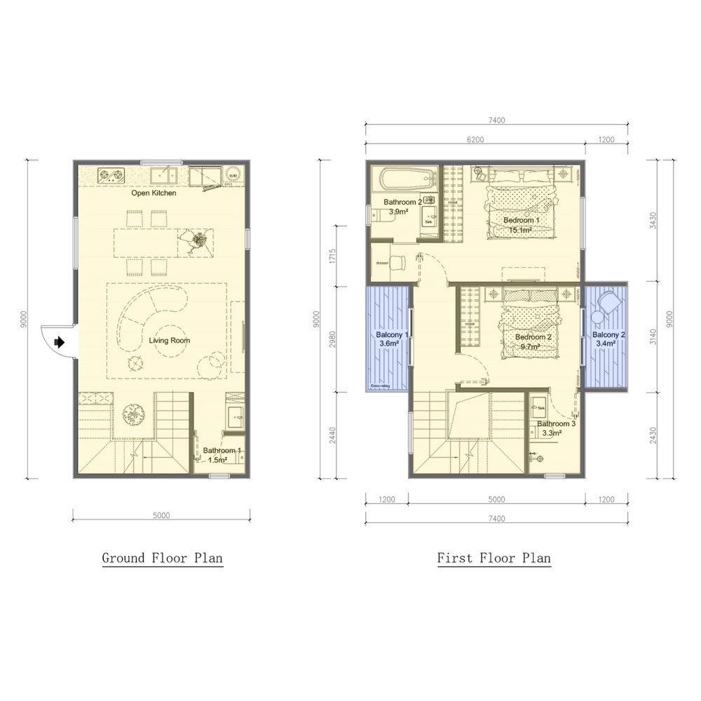 The design puts function first, without skimping on comfort. The ground floor opens into an open-concept kitchen and living room—ideal for hosting or keeping an eye on kids while cooking. A small, well-placed bathroom keeps daily needs within reach. Upstairs, the two bedrooms (each with a private bathroom) ensure everyone has their own space, while the dual balconies add versatility: south-facing for sunlit breakfasts, north-facing for evening shade. The light steel frame eliminates bulky load-bearing walls, so the space feels open and adaptable—if needs change later (say, adding a home office), the layout can shift easily.